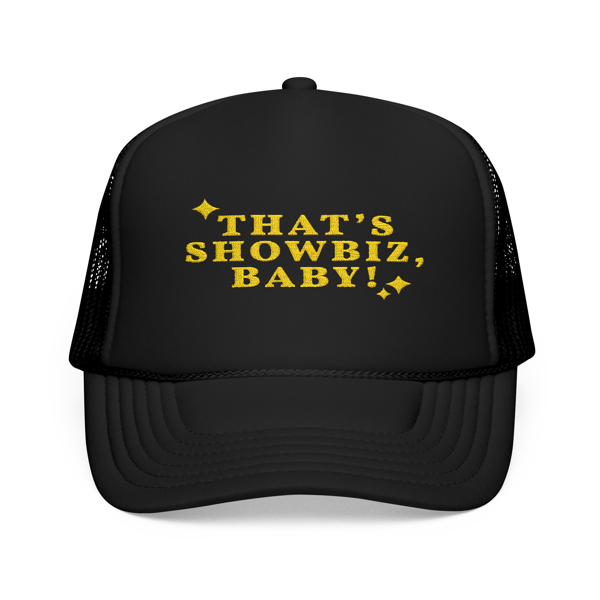 OTTO Cap 39-165. foam trucker hat. Black with yellow embroidery. Mesh back, snapback fit—built to survive festival heat, venue grime, and 2AM load-outs.